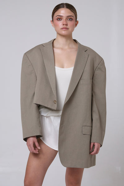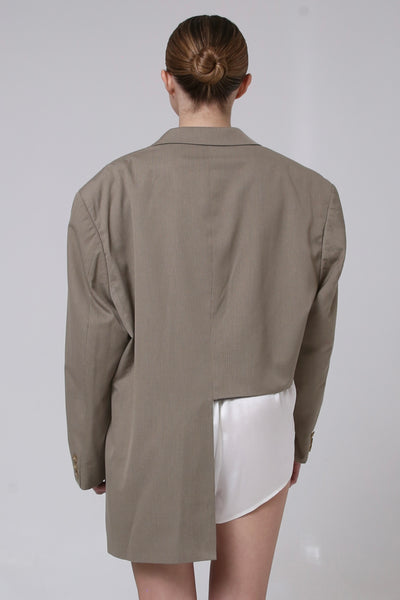 BLAZER OVERSIZED ASIMÉTRICO. CIERRE FRONTAL BOTÓN