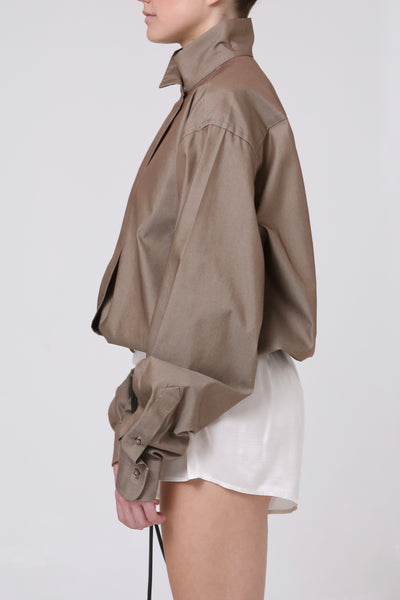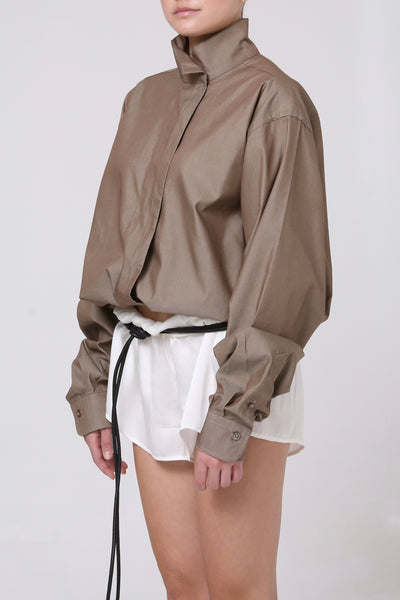 CAMISA CUELLO ALTO . CIERRE FRONTAL CON BOTONES OCULTOS. RESORTE EN PARTE BAJA