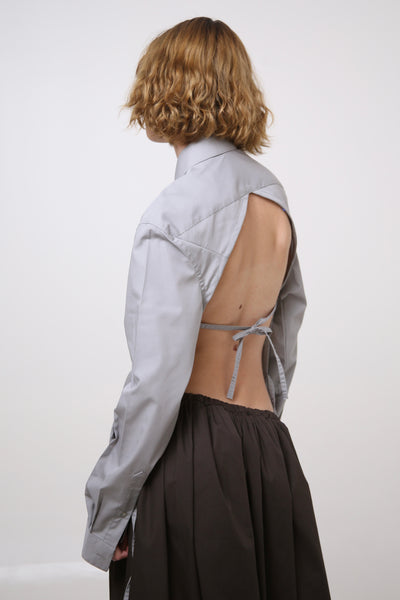 CAMISA MANGA LARGA , CIERRE FRONTAL CON BOTONES. AMARRE TRASERO CON TIRAS